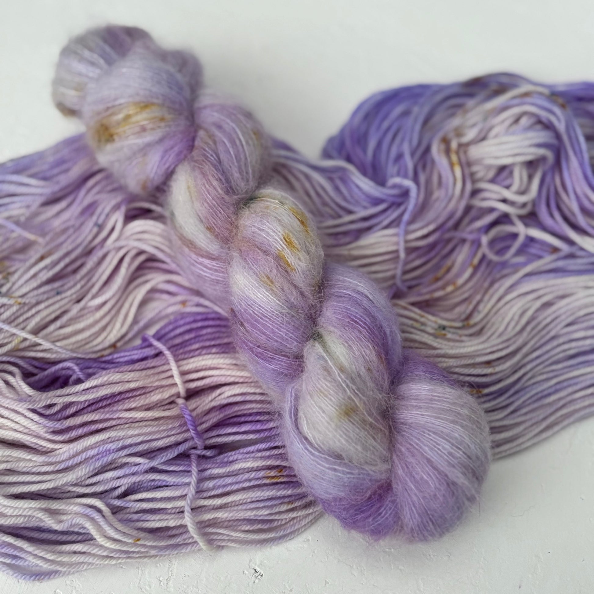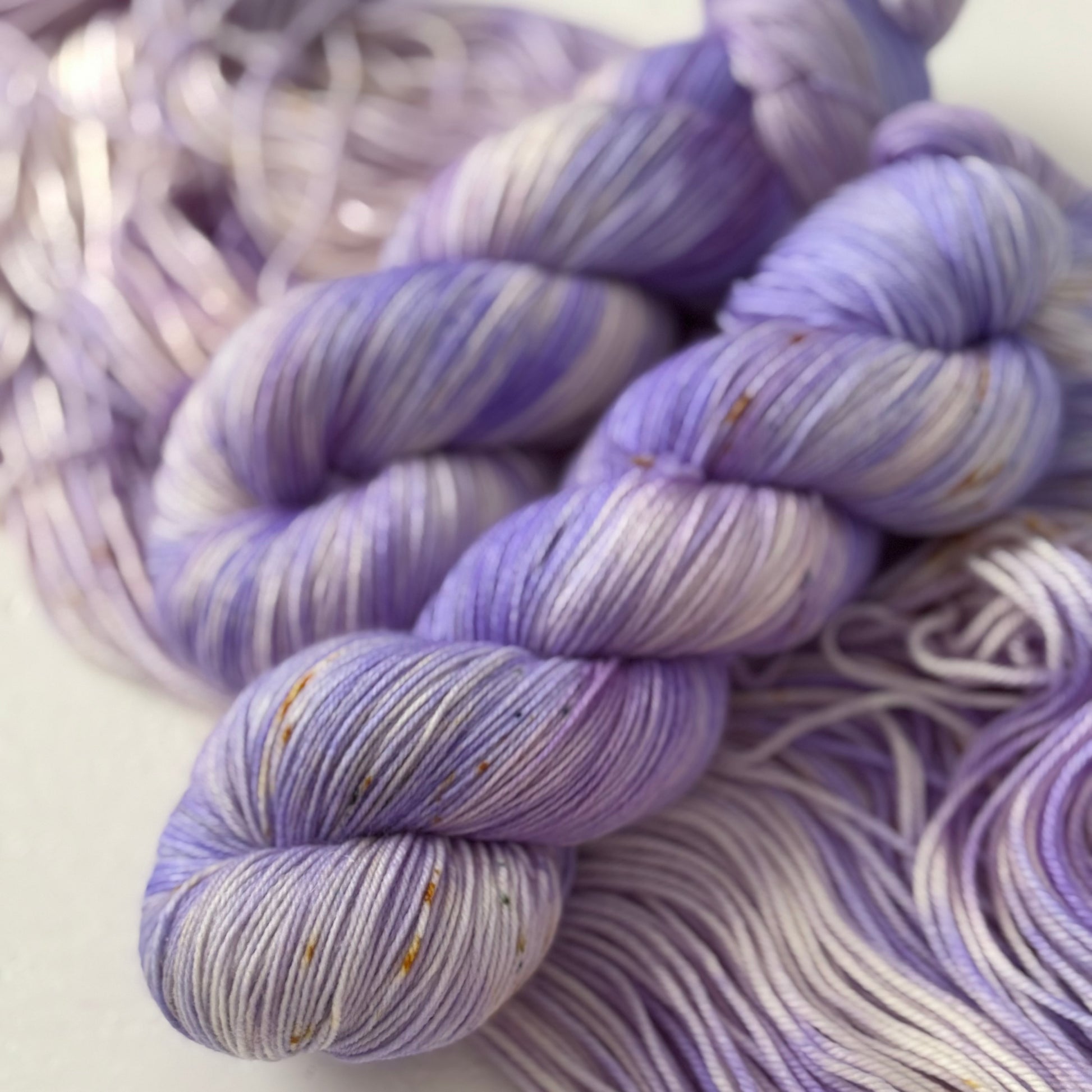 The September 2025 birth flower colorway, this hand dyed yarn features shades of soft purple and white, with a scattering of gold and mossy green speckles.