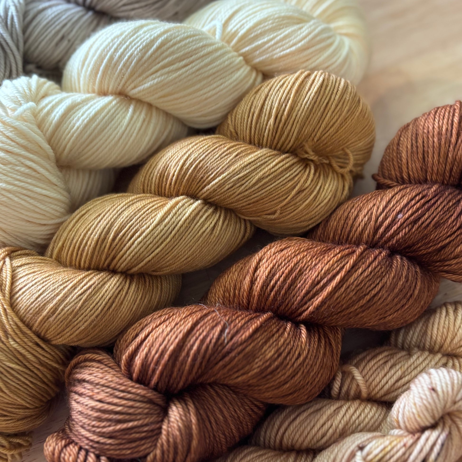 Mystery one-of-a-kind skeins in warm neutrals! They may be variegated, speckled, semisolid, light or dark - but the dominant color is in the brown, tan, warm gray, or cream family.
