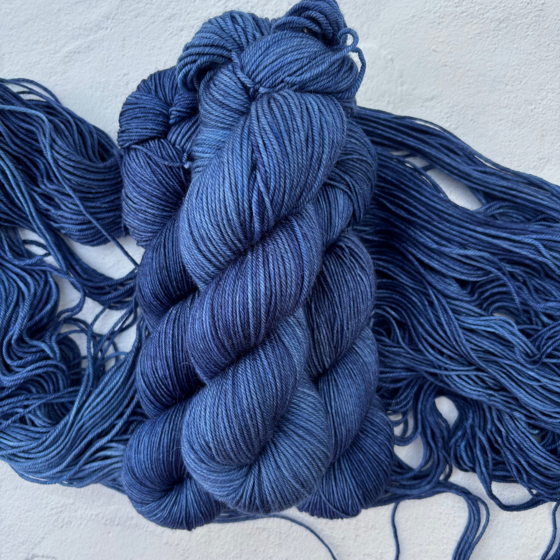 A tonal deep blue with shades of indigo and navy. On nonsuperwash merino this colorway is a more muted navy.
