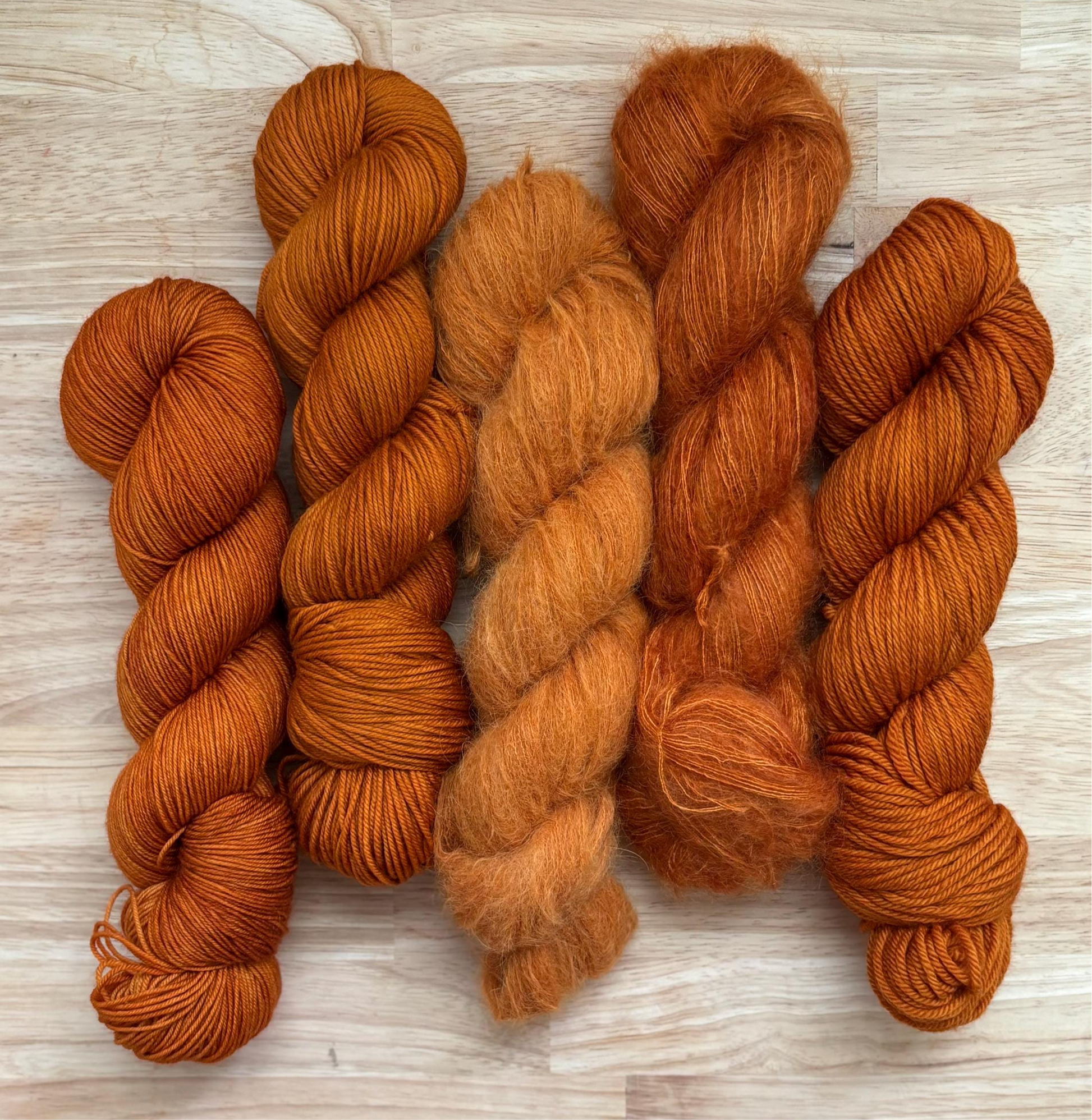 Hand dyed high quality yarn in a tonal earthy deep orange color, reminiscent of dancing flames and woodland creatures.